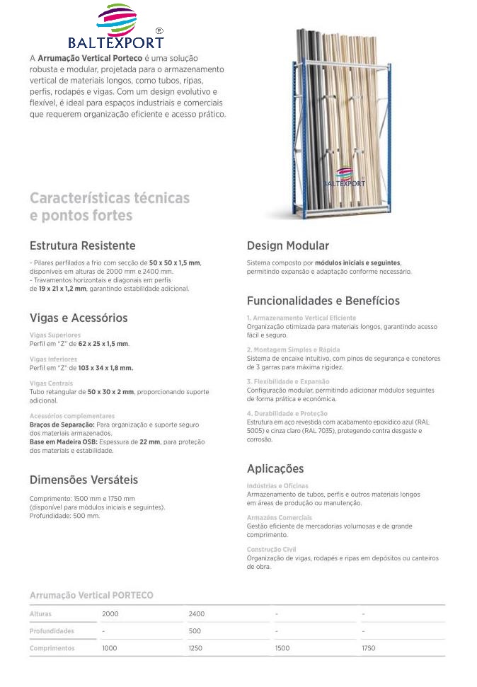 – Pilares perfilados a frio com secção de 50 x 50 x 1,5 mm, disponíveis em alturas de 2000 mm e 2400 mm.