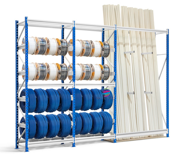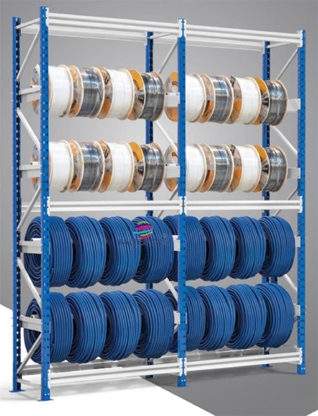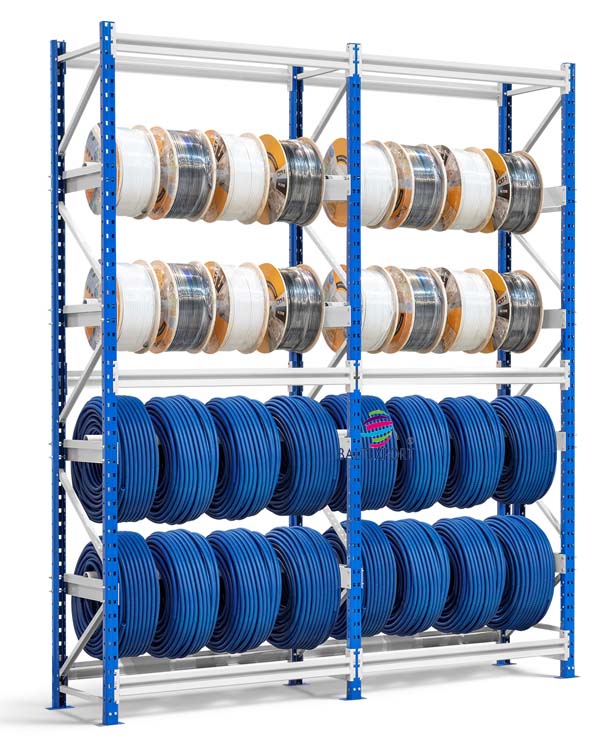 A Estante Metálica Porta Bobines é uma solução evolutiva e modular, ideal para o armazenamento e desenrolamento de bobinas de arame, tubos elétricos, cabos e outros materiais cilíndricos.