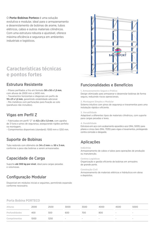Design otimizado para armazenar e desenrolar bobinas de forma segura, reduzindo riscos operacionais.